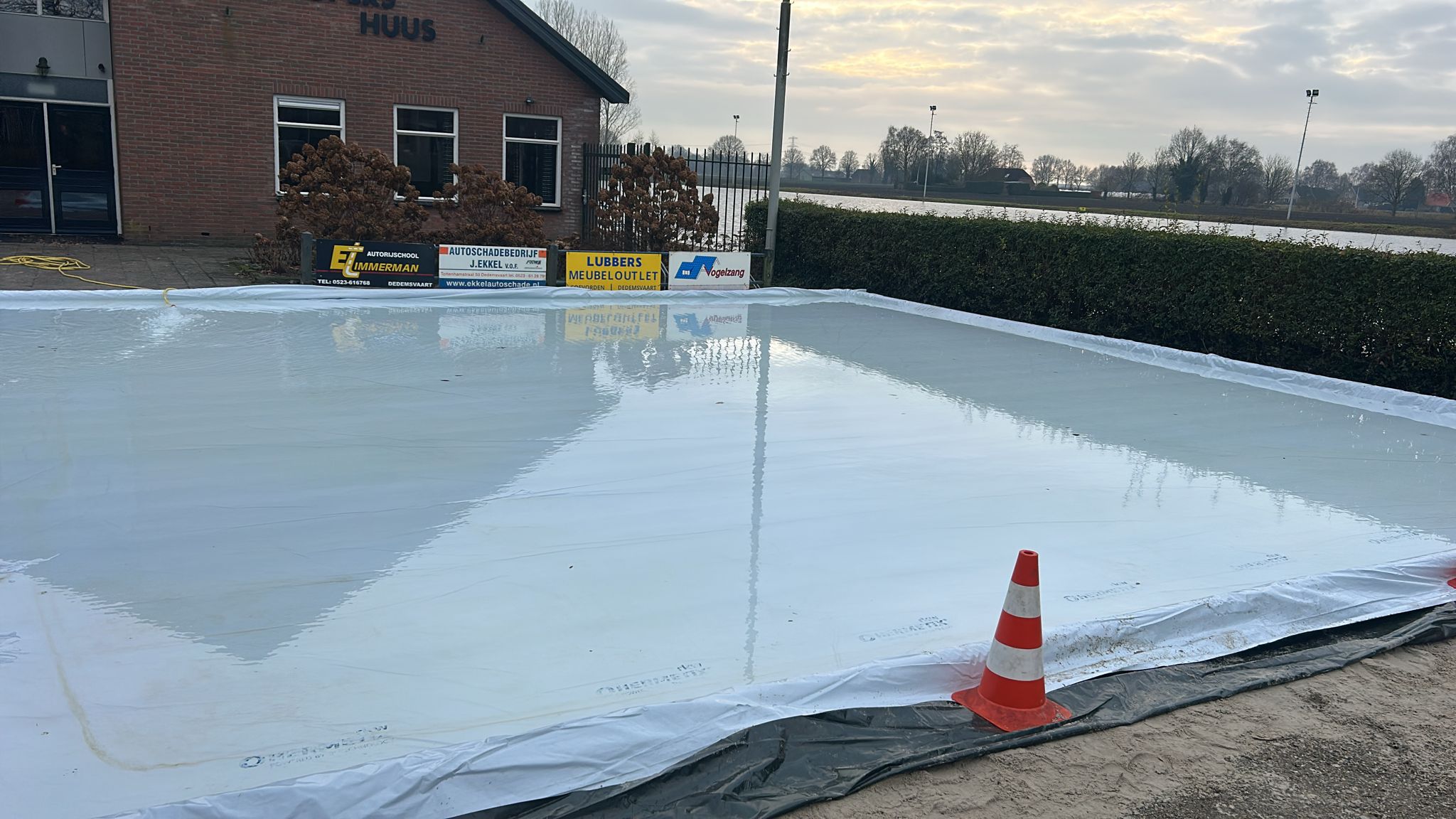 Na een aantal nachten vorst ligt er ijs op de ijsbaan, het is niet veel, maar de eerste 2cm is een feit, nu hopen dat de vrieskou gaat doorzetten.